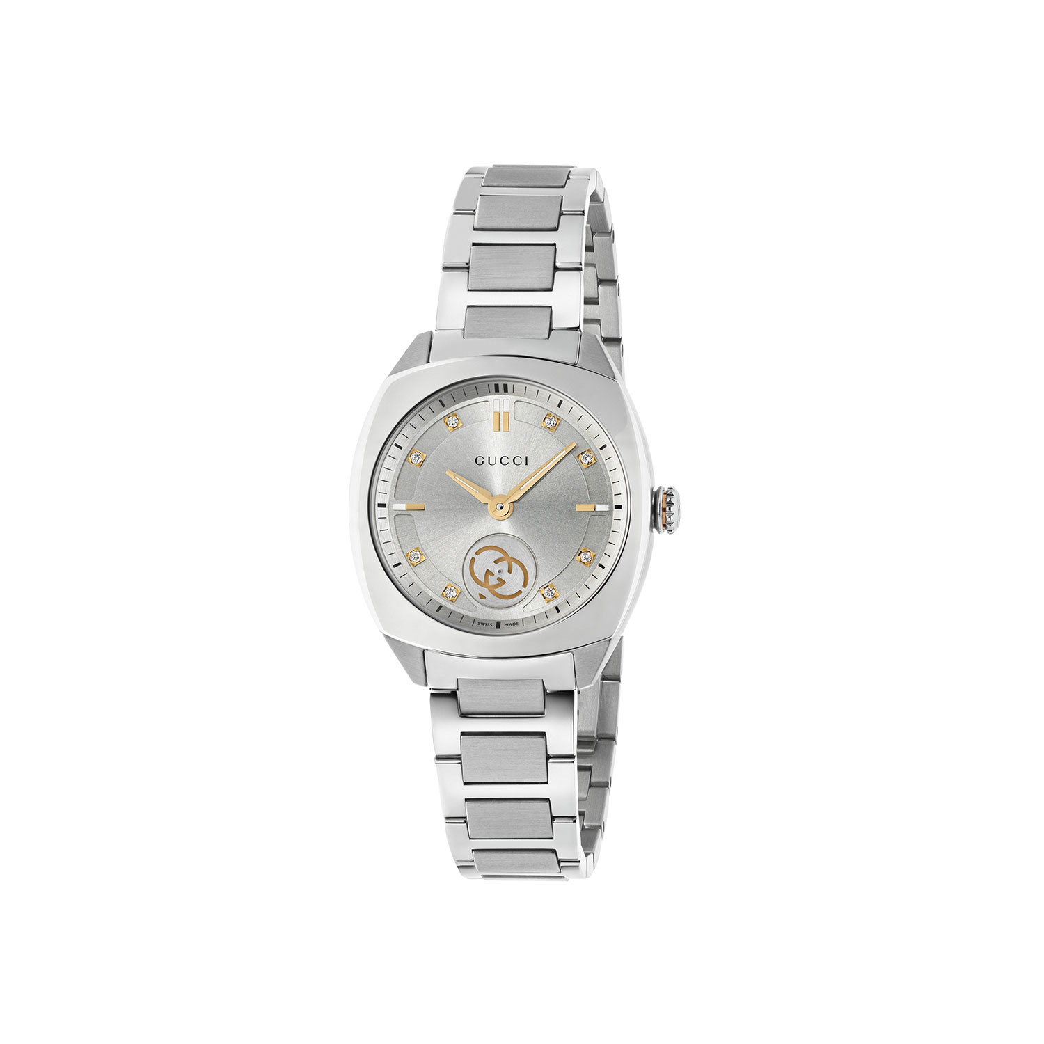CASSA IN ACCIAIO INOX DA 29 MM, QUADRANTE IN ARGENTO SPAZZOLATO CON 8 DIAMANTI E DETTAGLI PLACCATI ORO ROSA, PICCOLO QUADRANTE DEI SECONDI CON INCROCIO GG, BRACCIALE IN ACCIAIO INOX
